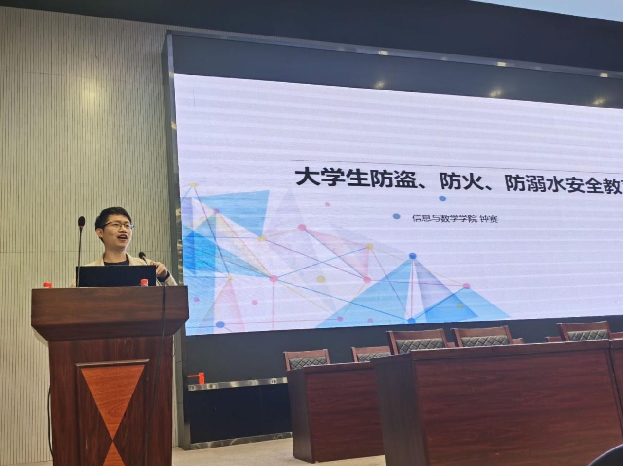 第三部分,钟赛老师就防火防盗放溺水进行宣讲。并用短视频的形式展现了天津港火灾发生时熊熊烈火带来的毁灭性的破坏,给大一新生们敲响了警钟。随后,钟老师向大家展示了我们身边存在的溺水事件,溺水带来的惨痛让在座的每位大一学子刷新了对溺水的认识。在主讲完火灾与防溺水的知识后,钟老师用PPT向大家详细的总结了遇到火灾以及遭受溺水的逃生技巧,技巧具有很强的实用性。
